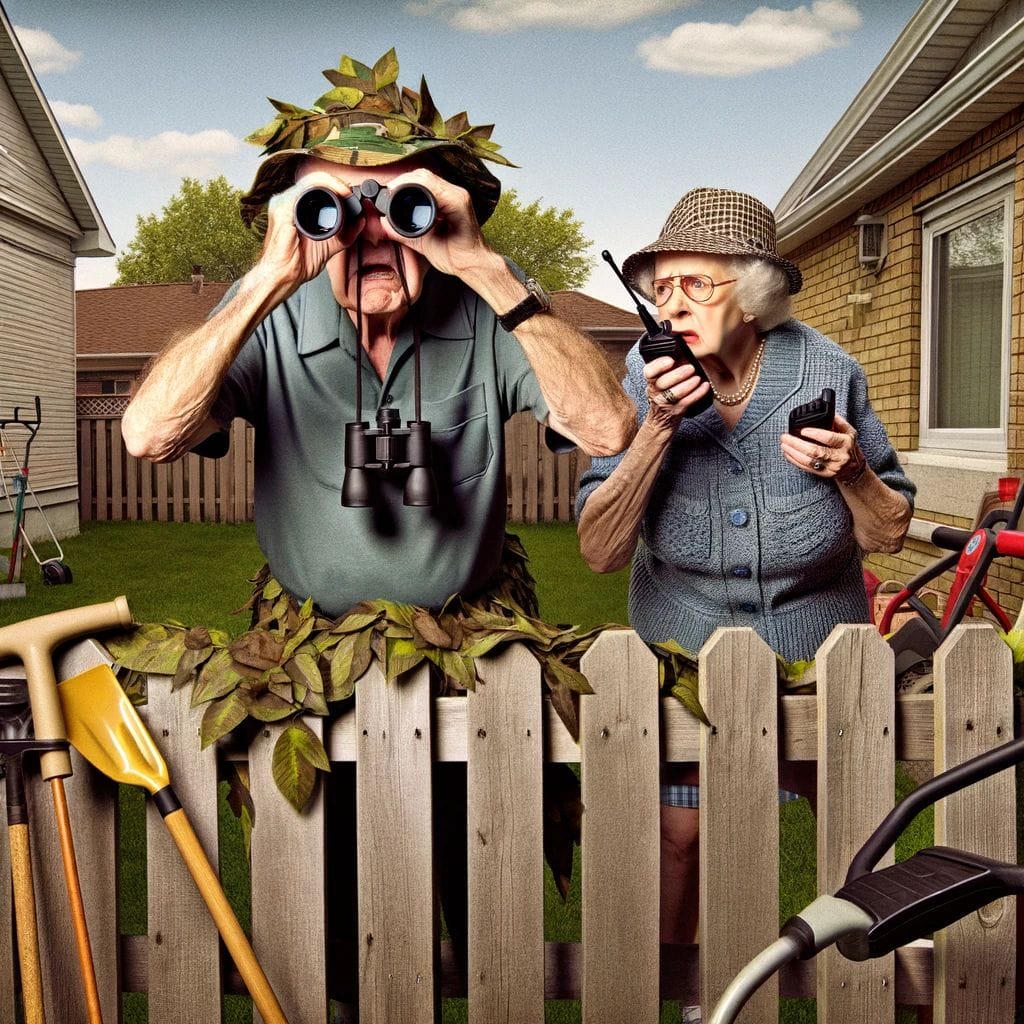 Tonight’s the big operation. I’m going full camouflage, face paint and all. Gonna crawl through the bushes, get a closer look. Margie, you’re on comms, we got walkie-talkies. We’re like those spy couples on TV, only with more arthritis and even more cocktails after we’re done.